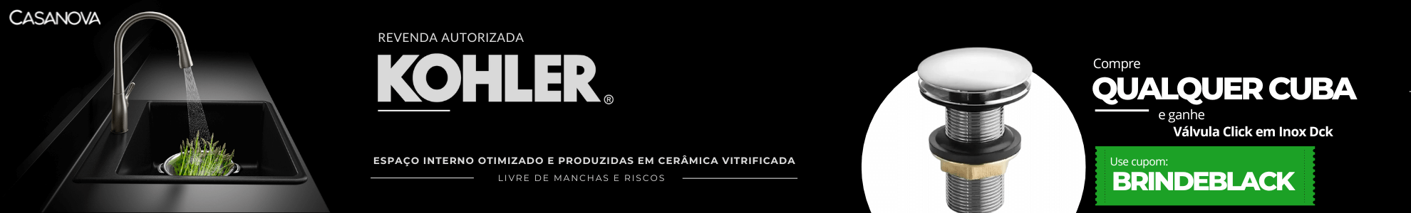 Na compra de qualquer cuba Kohler, leve GRÁTIS uma Válvula Click DCK. Adicione a válvula no seu carrinho e no checkout use o cupom BRINDEBLACK